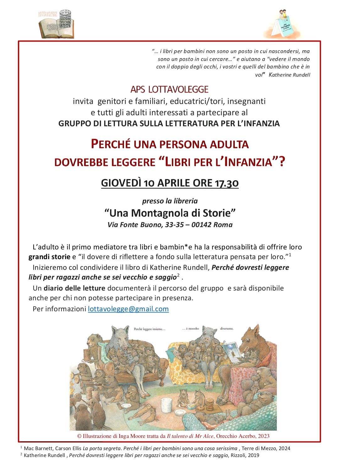 GIOVEDì 10 APRILE ore 17:30L'APS LOTTAVOLEGGE invita genitori, educatrici/tori, insegnanti e tutti gli adulti interessati a partecipare al GRUPPO DI LETTURA SULLA LETTERATURA PER L'INFANZIA.Perché una persona adulta dovrebbe leggere "libri… Leggi tutto »Gruppo di lettura sulla letteratura per l’infanzia