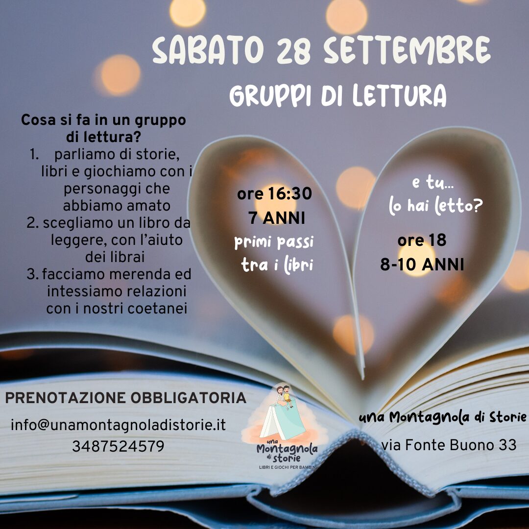 GRUPPI DI LETTURA SABATO 28 SETTEMBREGRUPPI DI LETTURADoppio appuntamentoPRIMI PASSI TRA I LIBRIore 16:30 per bambine e bambini di 6-7 anniE TU LO HAI LETTO?ore 18 bambine e bambini dagli 8 ai 10 anniPRIMI PASSI TRA I LIBRI GRUPPO 6-7 ANNICon il dei bambini e delle bambine di 6-7 anni leggiamo insieme un libro durante l’incontro… Leggi tutto »Gruppi di Lettura