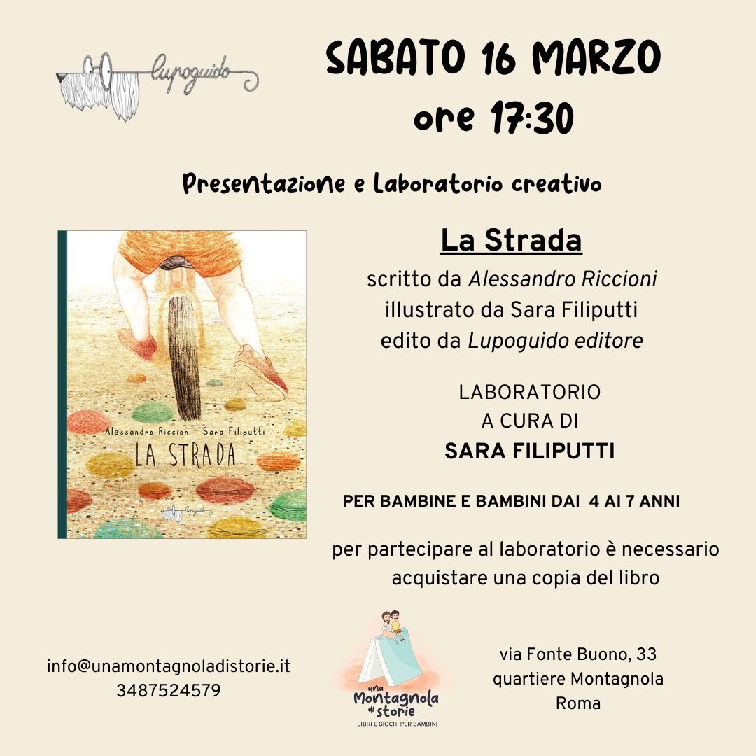 Presentazione-Laboratorio del libro "La Strada" SABATO 16 MARZO ore 17:30-19Presentazione e laboratorio a partire dalla lettura dell'albo illustrato"La Strada" di Alessandro Riccioni e illustrato da Sara Filiputti, edito da Lupoguido.Laboratorio a cura dell'illustratrice Sara FIliputti.incontro per bambine e bambini dai 4 ai 7 anniper partecipare al laboratorio è necessario acquistare il libro (costo:15€)prenotazione obbligatoria Prenota… Leggi tutto »La Strada – Presentazione e laboratorio di Sara Filiputti