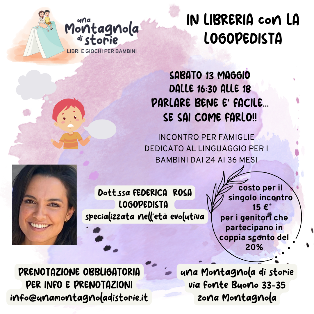 SABATO 21 OTTOBRE ORE 11-12:30PARLARE E' FACILE, SE SAI COME FARLO!Incontro a cura della Dottoressa Federica Rosa,Logopedista specializzata nell’età evolutiva, dedicato ai genitori, di bambini dai 6 ai 36 mesi. In questo interessantissimo incontro faremo un viaggio alla scoperta del linguaggio per questa fascia d’età, buone prassi per il migliore sviluppo linguistico dei bambini in famiglia,… Leggi tutto »Parlare è facile, se sai come farlo!