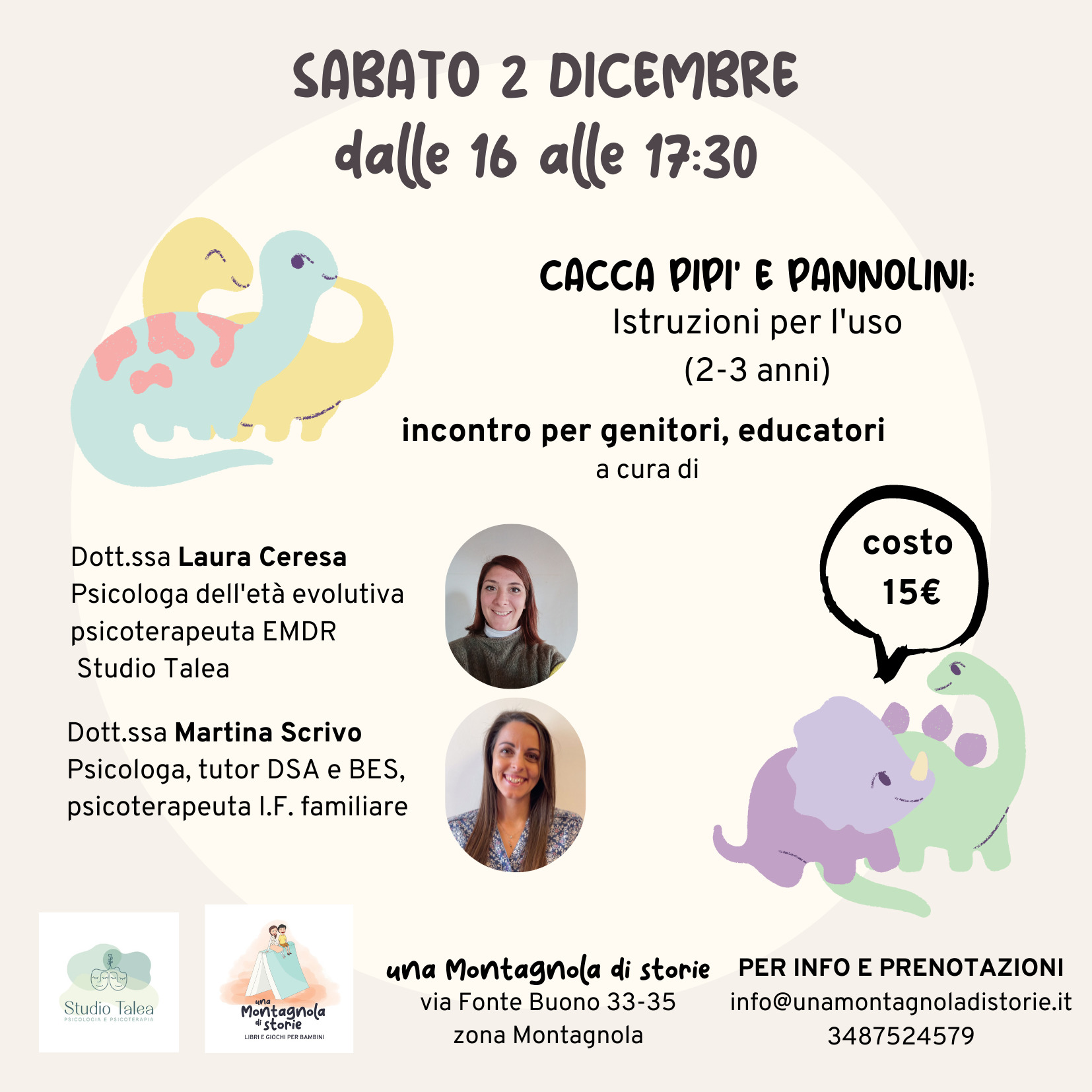 Sabato 2 Dicembre dalle 16 alle 17:30 ospiteremo la dott.ssa Laura Ceresa e la dott.ssa Martina Scrivo per affrontare un nuovo tema: lo spannolinamento. Esploreremo le valenze affettive legate a questi aspetti troppo spesso percepiti solamente come fisici. Avrete la possibilità di porre domande alle professioniste e confrontarvi con altri genitori che come voi si… Leggi tutto »Cacca, pipì e pannolini