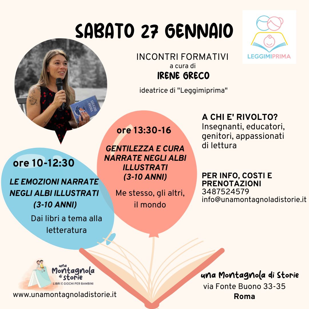 In libreria con Irene Greco SABATO 27 GENNAIO 2024Doppio appuntamento con Irene Greco, ideatrice di Leggimiprima.ore 10-12:30 LE EMOZIONI NARRATE NEGLI ALBI ILLUSTRATI (fascia di riferimento 3-10 anni)ore 13:30 -16 GENTILEZZA E CURA NARRATE NEGLI ALBI ILLUSTRATI (fascia di riferimento 3-10 anni)COSTI:singolo incontro (a sceltra tra quello della mattina o del pomeriggio): 35€entrambi gli incontri:… Leggi tutto »In libreria con Irene Greco