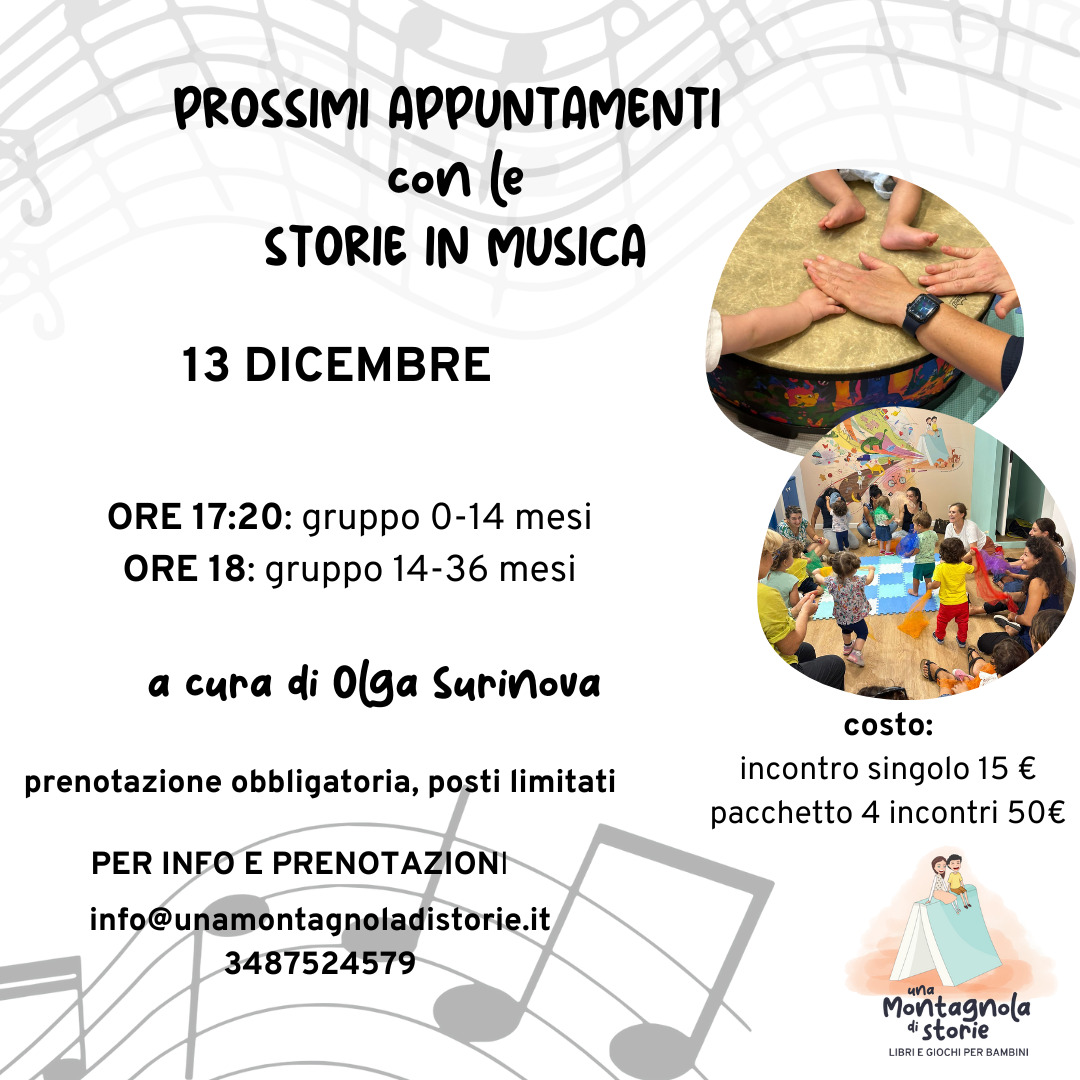 MERCOLEDI’ 13 DICEMBREDoppio appuntamento con le storie in musica a cura di Olga Surinova:ore 17:20 per bambini e bambine 0-14 mesiore 18 per bambini e bambine 14-36 mesi (da quando già sanno camminare)costo: 15€ a bambino/aprenotazione obbligatoria Prenota via mail Prenota via telefono