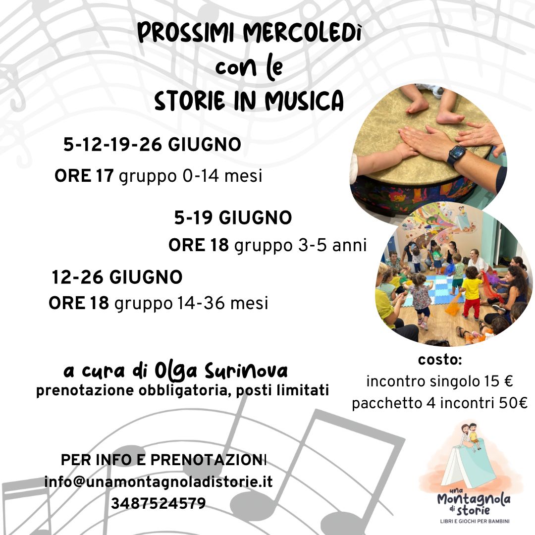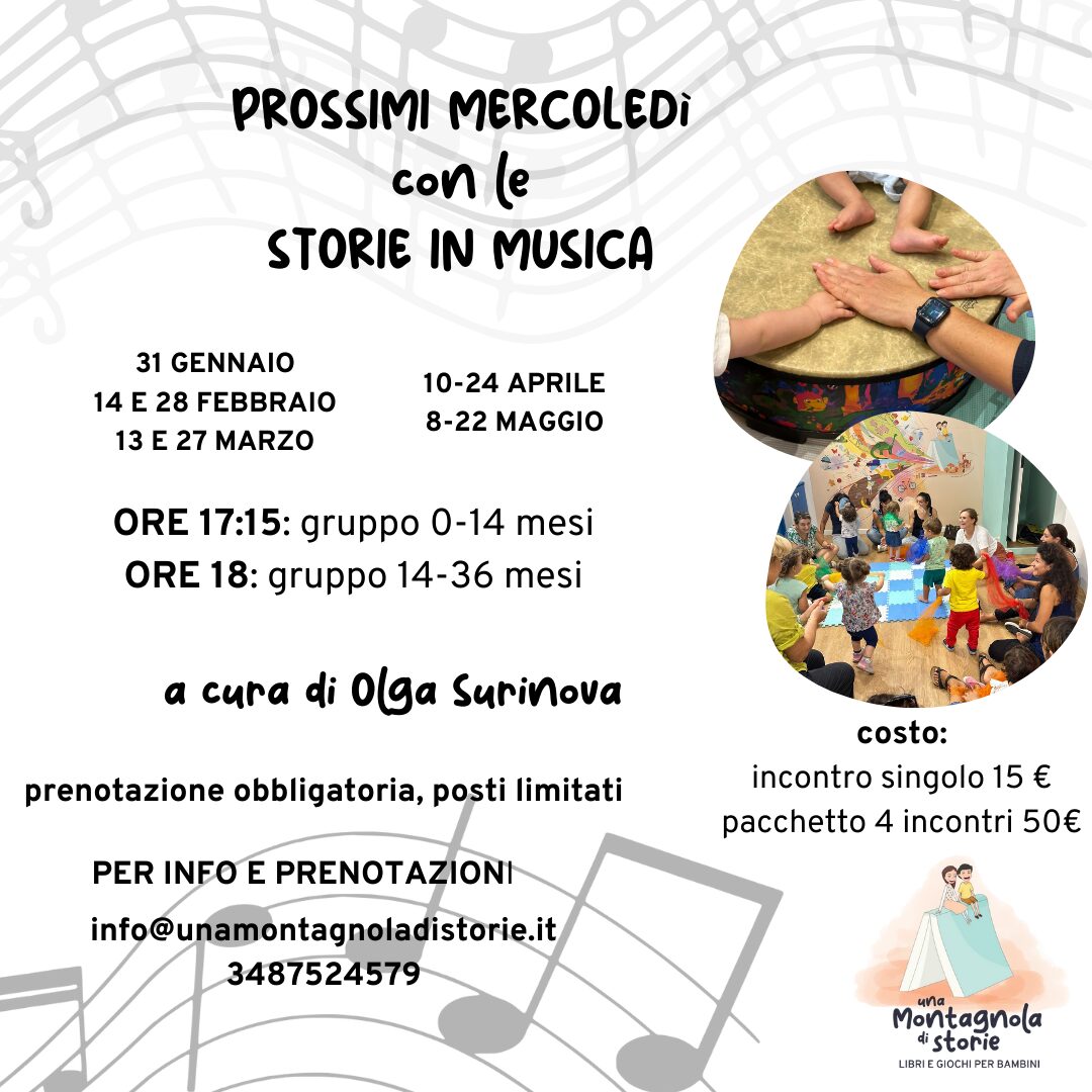 STORIE IN MUSICAAppuntamento con la musica per i più piccoli, gli incontri si tengono ogni 15 giorni.le date dei prossimi appuntamenti:13 e 27 marzo10 e 24 aprile8 e 22 maggioDoppio appuntamento con le storie in musica a cura di Olga Surinova:ore 17:15 per bambini e bambine 0-14 mesiore 18 per bambini e bambine 14-36 mesi (da quando già sanno… Leggi tutto »Storie in Musica