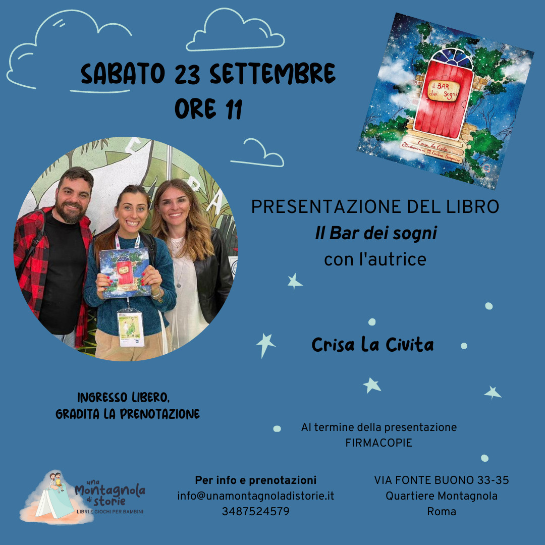 SABATO 23 SETTEMBRE ore 11 PRESENTAZIONE DEL LIBRO “Il bar dei sogni” Crisa La Civita, l’autrice, sarà con noi per presentare la sua storia a tutti i bambini e le bambine. Al termine della presentazione sarà possibile acquistare la propria copia (è possibile prenotarla preventivamente) con dedica dell’autrice! Ingresso Libero, necessaria la prenotazione. Prenota via mail Prenota via telefono