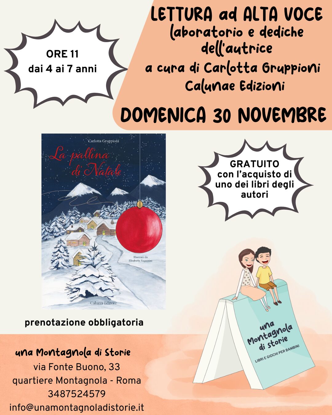 DOMENICA 30 NOVEMBRE ORE 11Appuntamento con Carlotta Gruppioni, autrice ed editrice di Calunae edizioni per la presentazione del libro La pallina di Natale.incontro dedicato ai bambini e alle bambine dai 4 ai 7 anni.appuntamento gratuito con l'acquisto del libro.prenotazione obbligatoria Prenota via mail Prenota via telefono