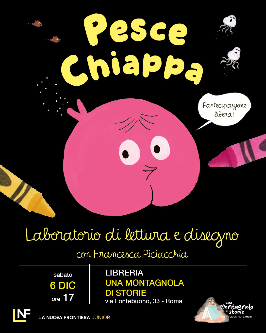SABATO 6 DICEMBRE ORE 17Laboratorio di lettura e di disegno a partire dall'albo illustrato Pesce Chiappa, di Pauline Pinson e Magali Le Huche, edito da La Nuova Frontiera Junior.Pesce Chiappa sembra un sedere. All’inizio anche lui si prende in giro, ma a un certo punto non ne può più.Un inno alla diversità, all’amicizia e alla fiducia… Leggi tutto »Pesce Chiappa – lettura e laboratorio