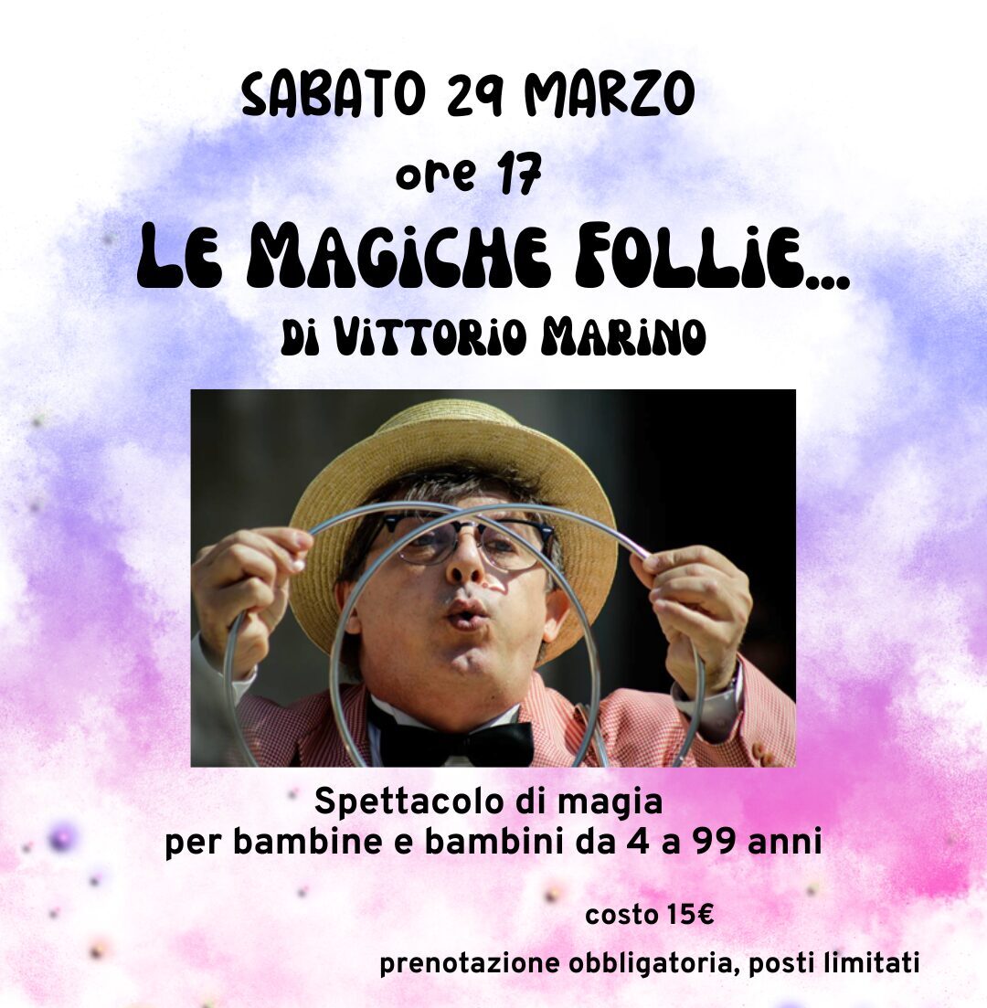SABATO 29 MARZO ore 17 Il protagonista è un prestigiatore, un onesto imbroglione che usa l'arte dell'inganno per regalare  sorrisi e meraviglia al suo pubblico, coinvolgendolo nei suoi incredibili esperimenti magici.La magia da sempre incanta il pubblico di tutte le età,se poi al fascino del mistero ed al gioco dell’inganno si accompagna una presentazione brillante e… Leggi tutto »Le magiche follie – spettacolo di magia