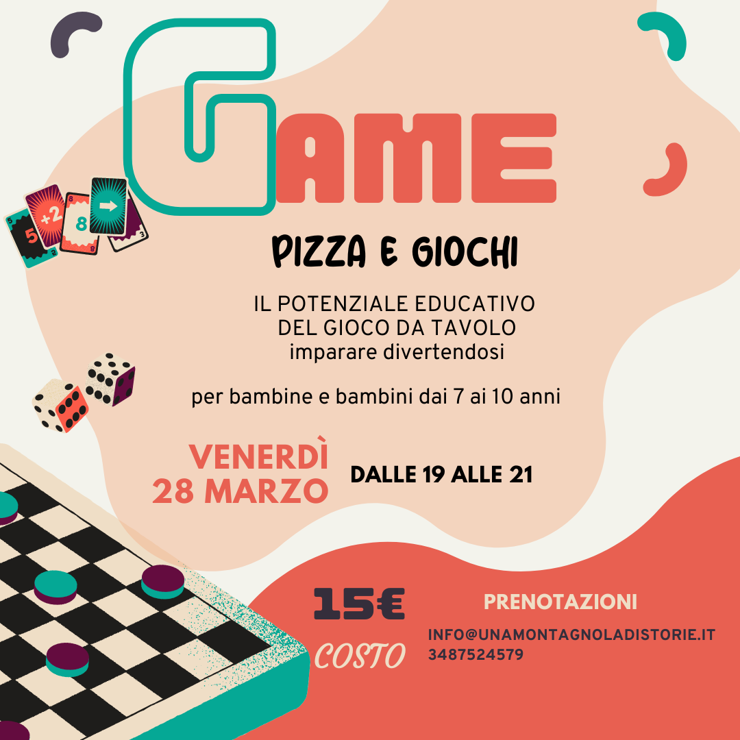 VENERDì 28 MARZO dalle 19 alle 21 APERIGIOCO  Torna il nostro appuntamento con i giochi da tavola per i bambini e le bambine dai 7 anni in su. Uno spazio divertente in cui poter sfidare se stessi e i propri coetanei in sfide di velocità, fantasia, colori e tanto altro... Al termine delle accese sfide… Leggi tutto »PIZZA E GIOCHI DA TAVOLO dai 7 anni
