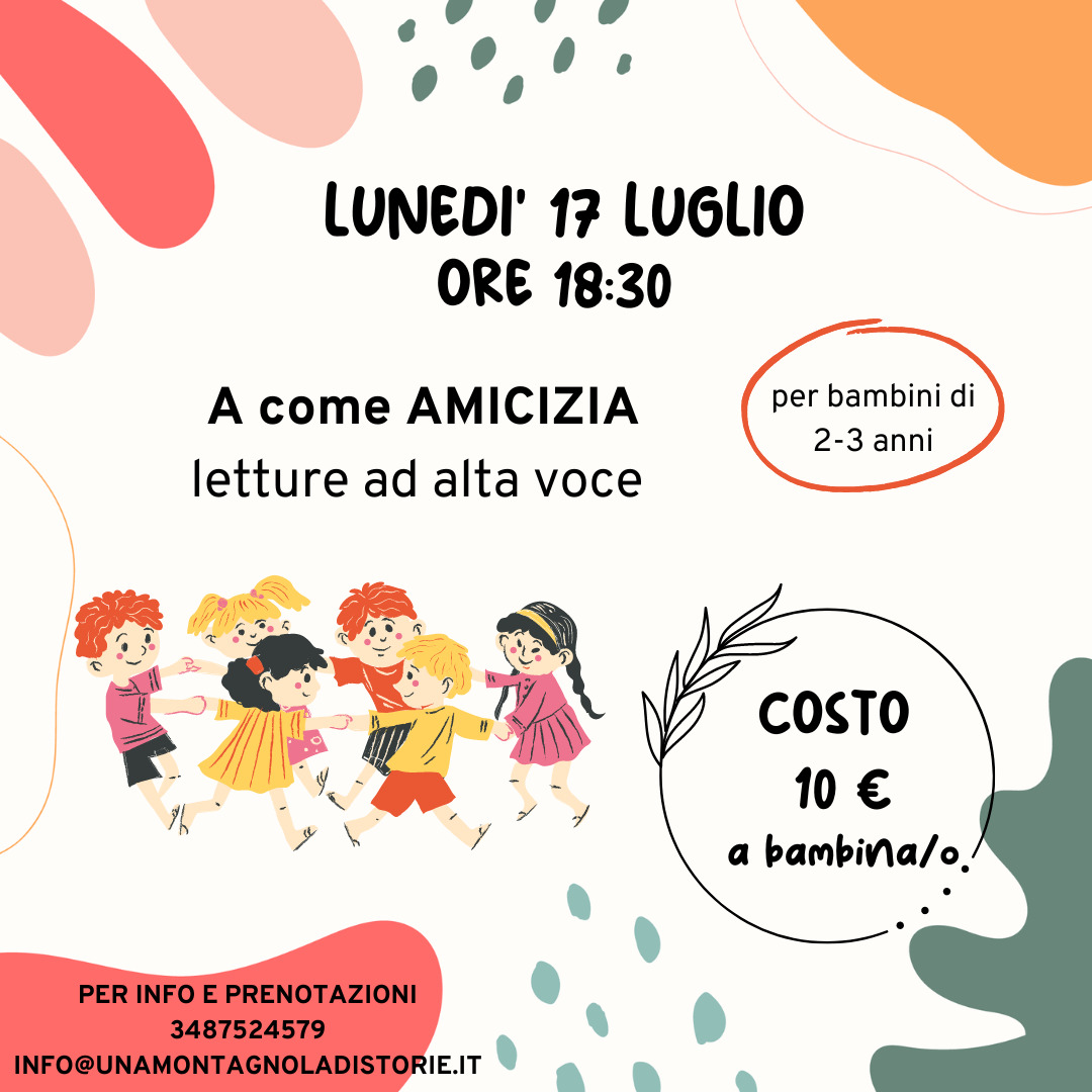 LUNEDI' 17 LUGLIO ore 18:30per bambini di 2-3 anniA come Amicizia, letture animate sul tema dell'amicizia,per rinfrescare i pomeriggi estivi.Al termine delle letture voteremo la nostra preferita!Vi aspettiamo in libreria! Prenota via mail Prenota via telefono