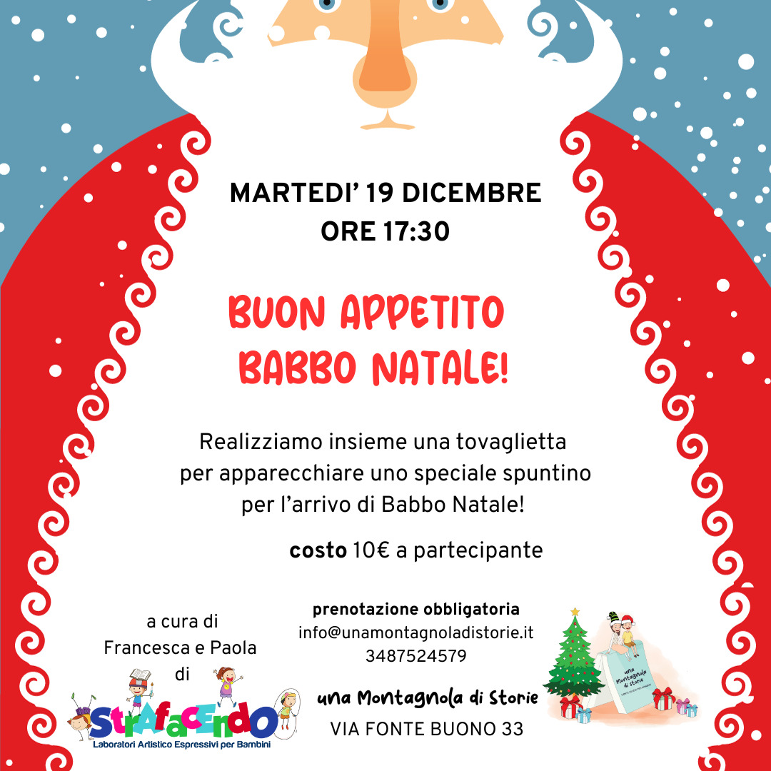 Tutto pronto per l'arrivo di Babbo Natale? MARTEDI' 19 DICEMBRE ORE 17:30Prepariamo insieme una splendida tovaglietta da tavolo,per apparecchiare la merenda a Babbo Natale!Sapete tutti che,Babbo Natale, la notte della vigilia viaggia moltoper arrivare nelle case di tutte le bambine e i bambini, allora è necessario preparargli uno spuntinoper farlo rifocillare e farlo arrivare dal… Leggi tutto »Buon Appetito Babbo Natale!