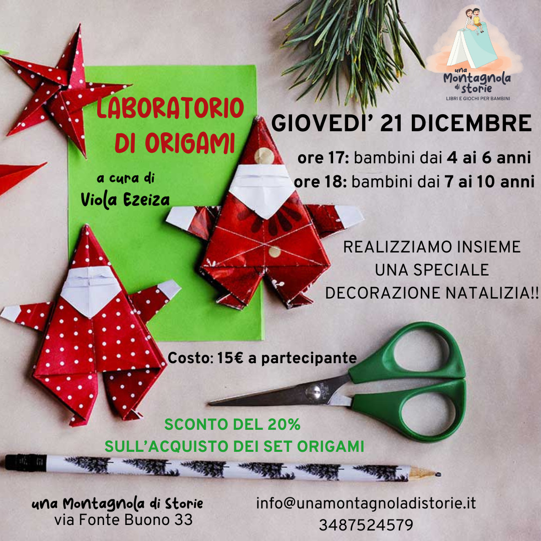 GIOVEDì 21 DICEMBRE Doppio appuntamento con la creazione degli origami:ore 17 per bambini dai 4 ai 6 anniore 18 per bambini dai 7 ai 10 anniRealizzeremo insieme a Viola una speciale decorazione di Natale.Costo: 15 euro a partecipante Prenota via mail Prenota via telefono