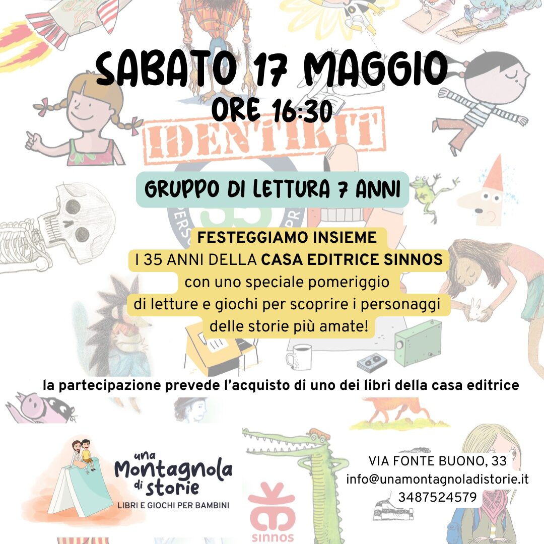 SABATO 17 MAGGIO ORE 16:30gruppo lettura 7 anniFESTEGGIAMO INSIEME I 25 ANNI DELLA CASA EDITRICE SINNOSgiochiamo con i personaggi delle storie più amate della casa editrice, leggiamo insieme e facciamo… Leggi tutto »GRUPPO DI LETTURA 7 ANNI