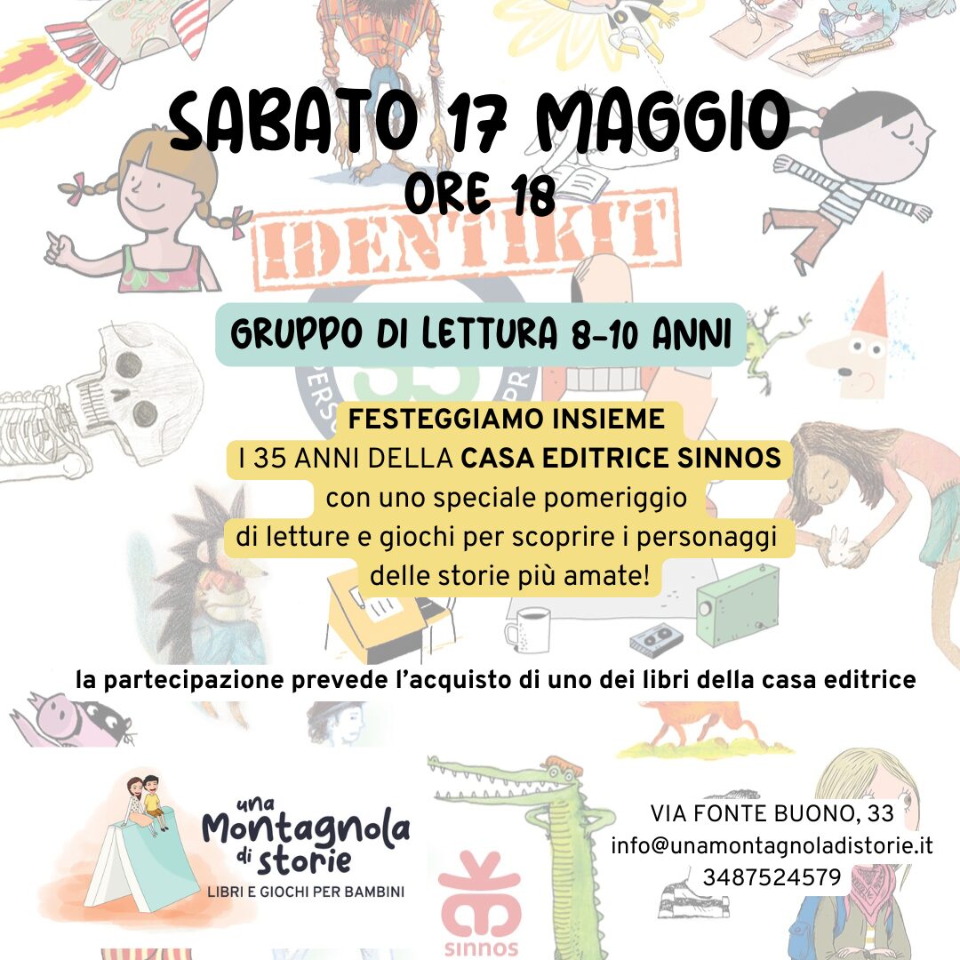SABATO 17 MAGGIO ORE 11gruppo lettura 6 anniFESTEGGIAMO INSIEME I 25 ANNI DELLA CASA EDITRICE SINNOSgiochiamo con i personaggi delle storie più amate della casa editrice, leggiamo insieme e facciamo… Leggi tutto »GRUPPO DI LETTURA 6 ANNI