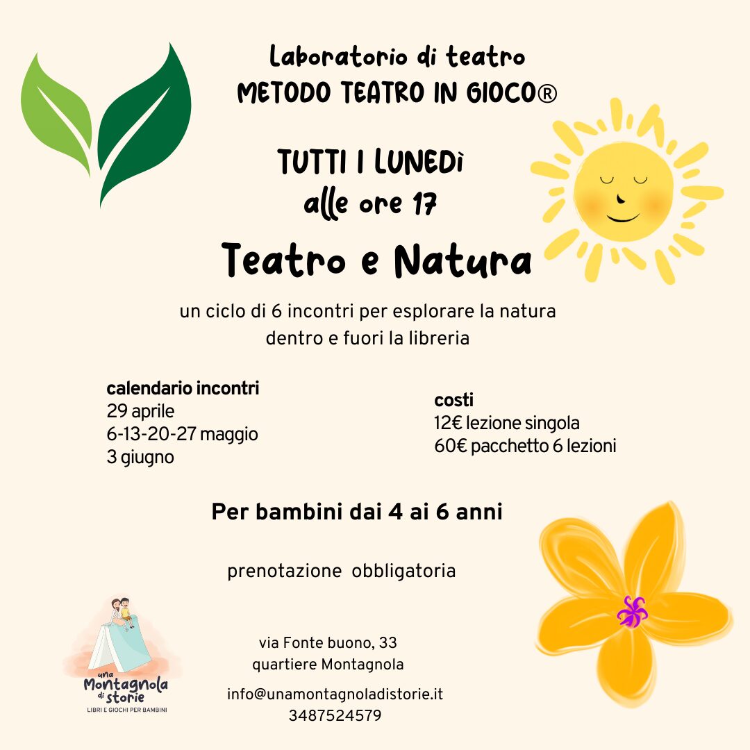 Teatro e Natura Tutti i lunedì ore 17 nuovo ciclo di incontri del laboratorio teatrale con il Metodo Teatro in Gioco® PER BAMBINI E BAMBINE DAI 4 AI 6 ANNI. Esploreremo insieme la natura, dentro e fuori la libreria. Di seguito il calendario degli appuntamenti: 29 aprile 6-13-20-27 maggio 3 giugno Il costo è di 12€… Leggi tutto »Teatro e Natura – Laboratorio teatro