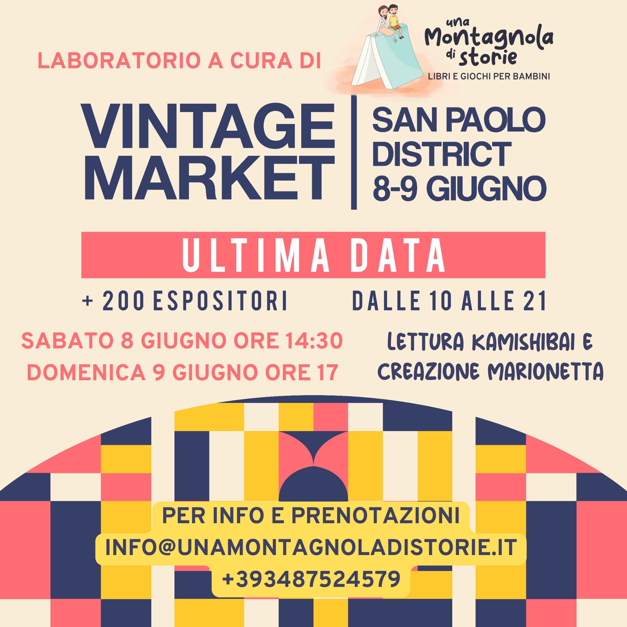 SABATO 8 GIUGNO ORE 14:30 DOMENICA 9 GIUGNO ORE 17 Nell'area bambini del Vintage Market Roma (San Paolo District - Via A. Severo, 46) svolgeremo un laboratorio per bambini e bambine dai 2 anni. Lettura kamishibai e creazione di marionette dei personaggi della storia. Vi aspettiamo! Prenota via mail Prenota via telefono