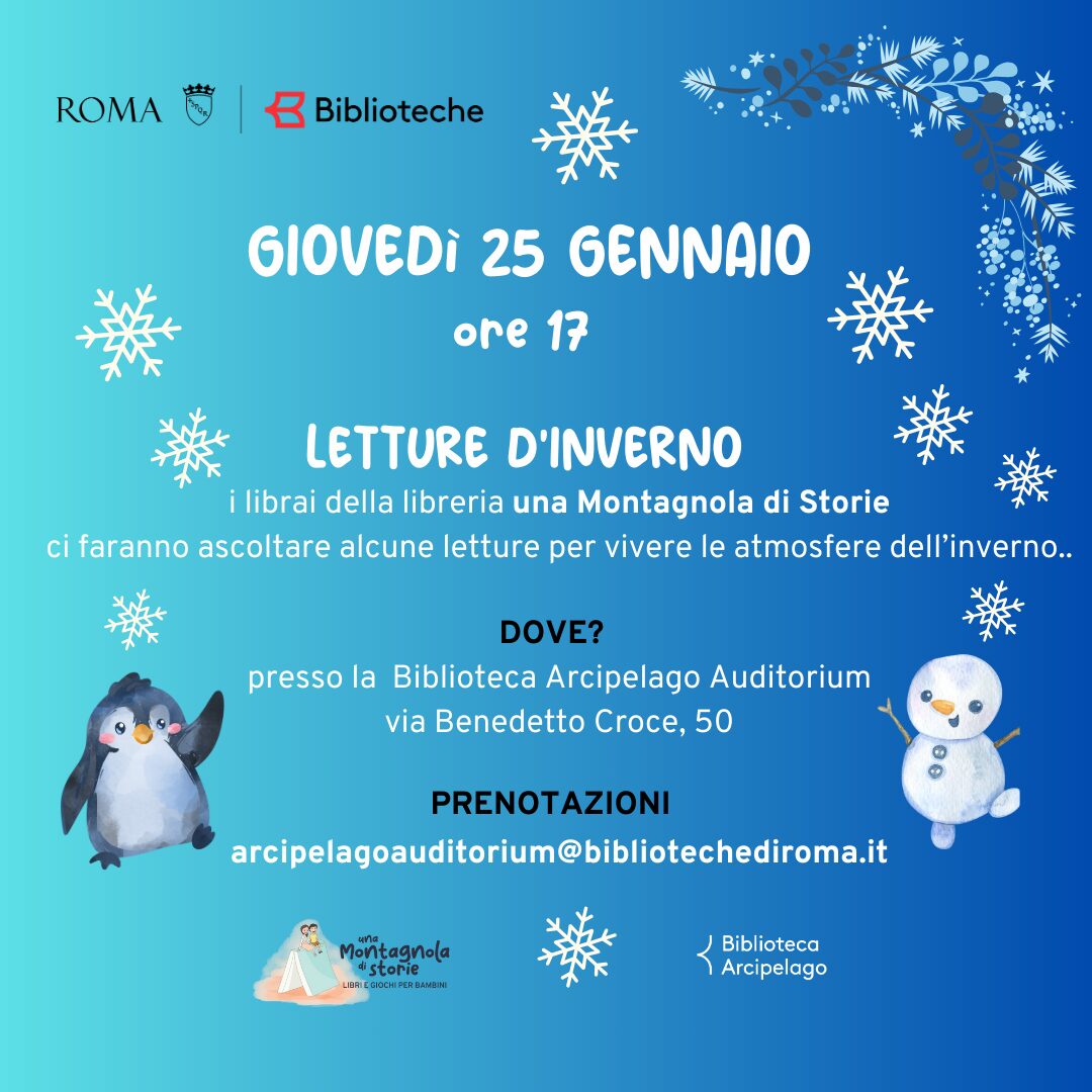 Letture in biblioteca GIOVEDì 25 GENNAIO ore 17Letture d'invernoper bambine e bambini dai 3 ai 6 annivi aspettiamo presso gli spazi della Biblioteca Arcipelago Auditorium (Via Benedetto Croce, 50) per leggere insieme alcuni albi illustrati e vivere l'atmosfera invernale.per le prenotazioni scrivere a  arcipelagoauditorium@bibliotechediroma.it